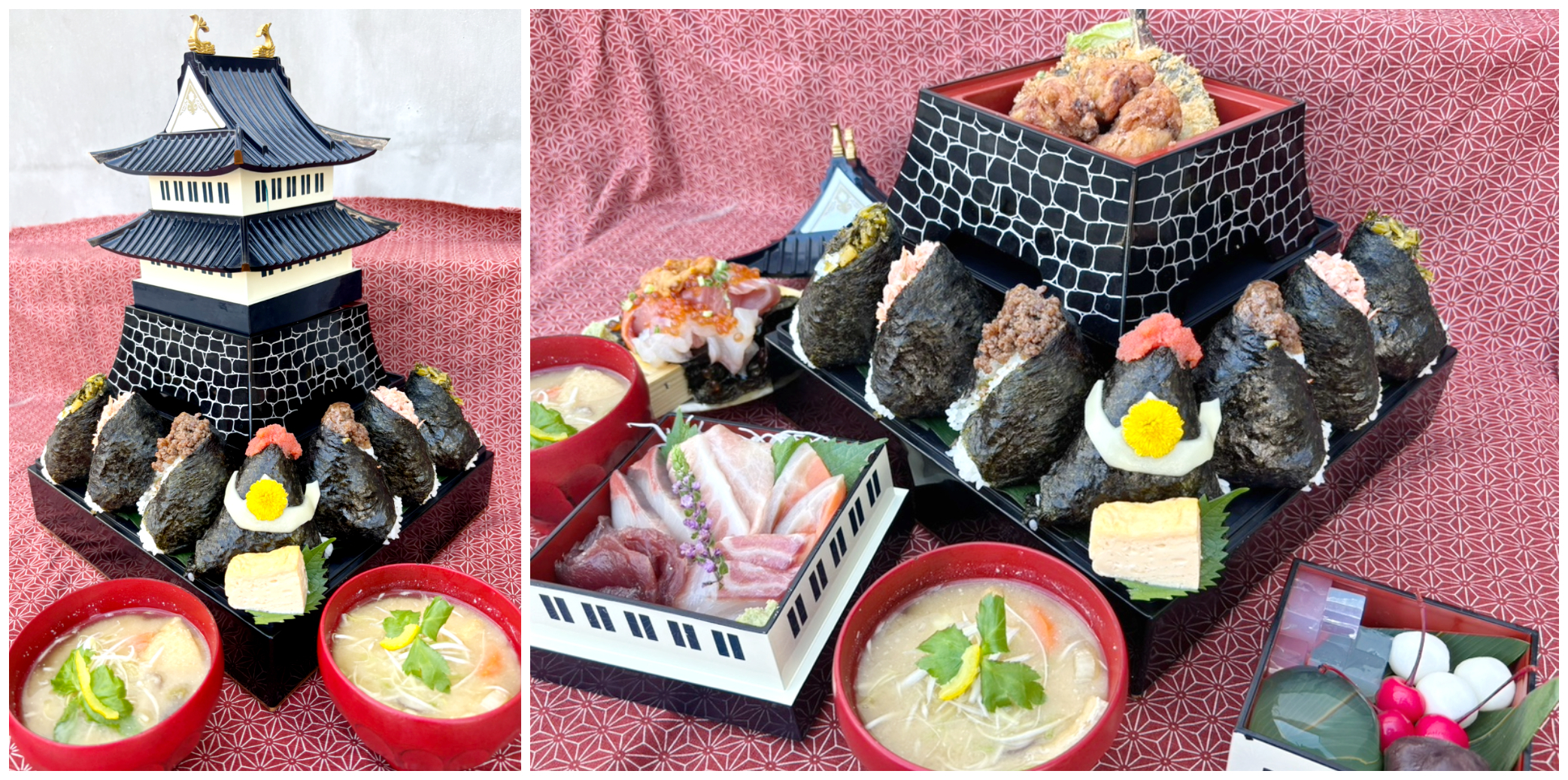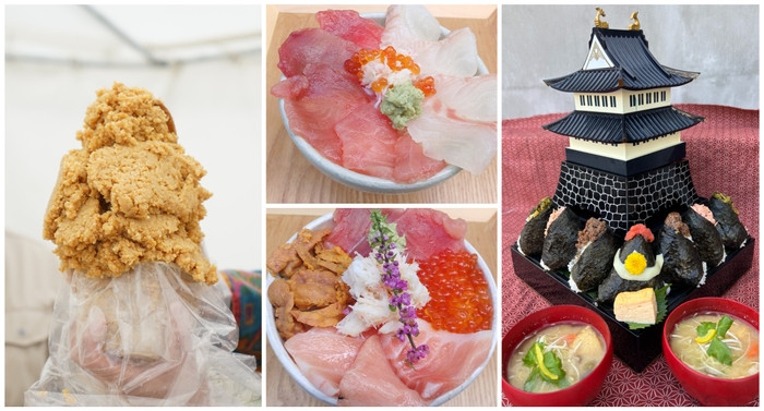 どどんとそびえ立つ、熊本城を彷彿とさせるお城は3段にわかれ、中にはやまうちの味噌醤油をつかったメニューがてんこ盛り!おにぎりの中にはよくよく見ると熊本城主の加藤清正の兜を模したおにぎりが鎮座。海鮮も一緒に味わえる豪華で特別なメニューです。