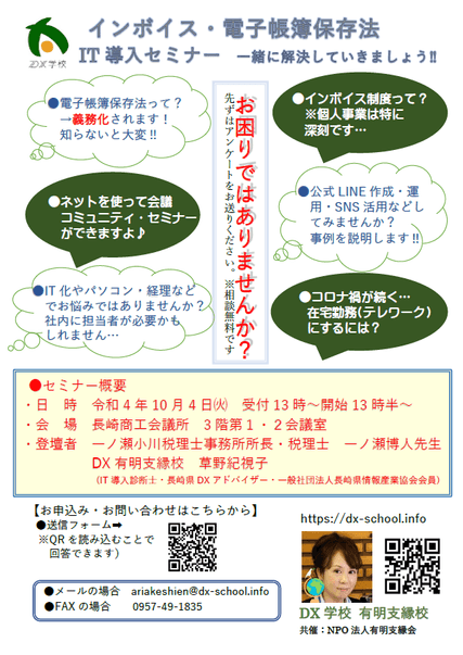 インボイス・電子帳簿保存・IT化を一緒に解決!DX有明支縁校が 長崎商工会議所・ZOOMにて10月4日にセミナーを開催