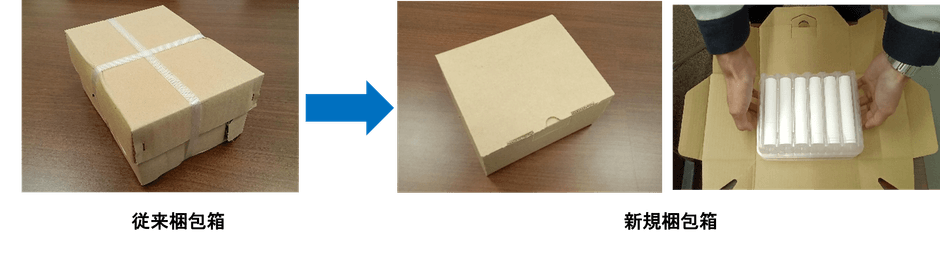 今回、小型のセラミック製品を梱包する最も使用量の多い梱包箱を、オール段ボール包装材にしたことにより、リサイクル性能の向上と、納入時の輸送効率が改善されたことでCO2排出量の削減を実現するとともに、風呂敷型の形状にしたことでお客様の作業効率改善にも貢献できる、環境にも人にも優しいセラミック製品用包装材を開発しました。