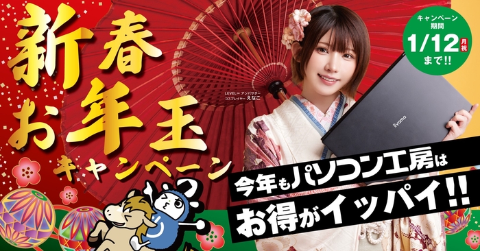 更に、LEVEL∞アンバサダー「えなこ」の「パソコン工房 × えなこ2026カレンダー」プレゼントや、お得なLINEクーポンの配布、人気ストリーマーが組み立てたハイスペックPCが抽選で当たるキャンペーンなど、豪華な「新春お年玉キャンペーン」も同時開催いたします。