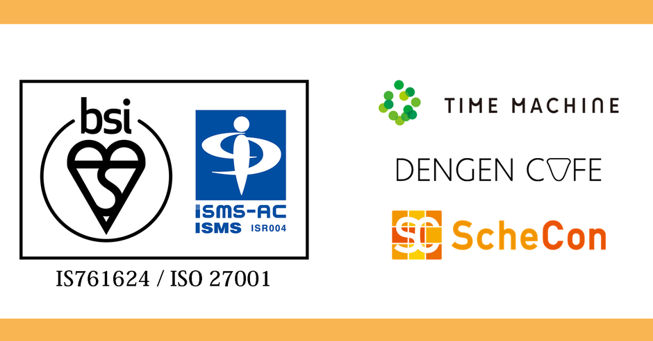 日程調整&オンライン名刺交換サービス「Schecon(スケコン)」を運営する『株式会社TIME MACHINE』(本社:東京都渋谷区、代表取締役社長・CEO:石澤 秀次郎/以下、タイムマシーン)と、グループ会社であり、充電/リモートワークできるカフェ検索サービス「DENGEN CAFE」を運営する『電源カフェ株式会社』(代表取締役:林 大勇/以下、電源カフェ)は、情報セキュリティマネジメントシステム(ISMS:Information Security Management System)の国際標準規格である「JIS Q 27001:2014(ISO/IEC 27001:2013)」の認証を取得したことをお知らせします。