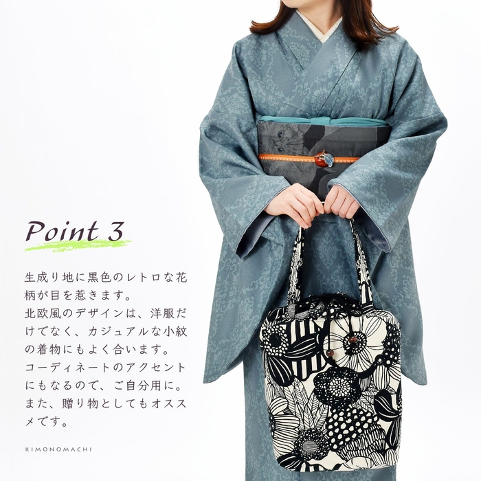 生成り地に黒色のレトロな花柄が目を惹きます。北欧風のデザインは、洋服だけでなく、カジュアルな小紋の着物にもよく合います。コーディネートのアクセントにもなるので、ご自分用に。また、贈り物としてもオススメです。