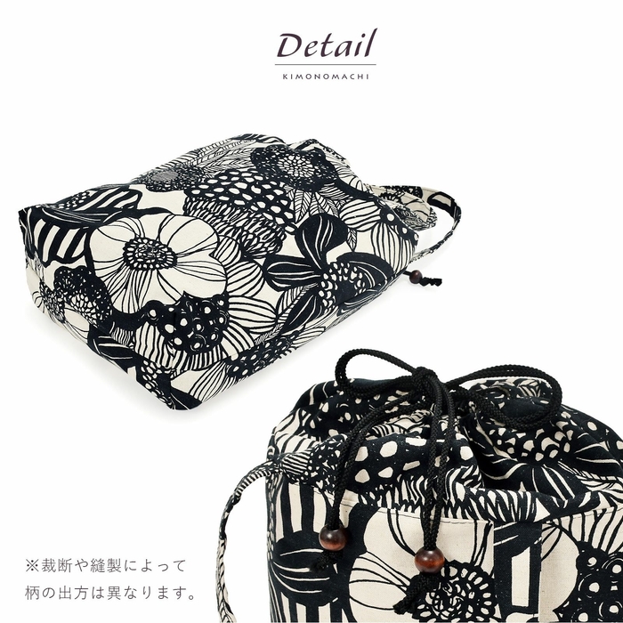 トートバッグの上部は巾着になっているので、中の荷物が見えてしまう心配もなく、防犯面も安心です。生地は、綿麻混の素朴な風合いが魅力のフラワープリント生地。汚れてもご家庭で気軽にお洗濯いただけます。ちょっとしたお出掛けや習い事用のレッスンバッグなど、様々な場面で重宝します。