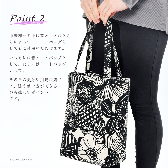 巾着部分を中に落とし込むとことによって、トートバッグとしてもご使用いただけます。いつもは巾着トートバッグとして、たまにはトートバッグとして。