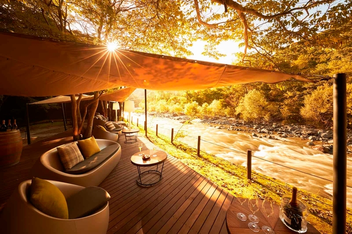 特徴2 愛犬と一緒に夕日に照らされ煌めく渓流を眺めながらの夕食
