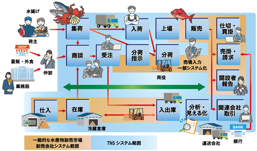 「uniSQUARE TNS」は、水産卸売市場の荷受け会社様の販売管理業務に特化し、荷受け業務から販売、在庫、請求、管理会計、など、荷受け業務をトータルでサポートする基幹情報システムです。