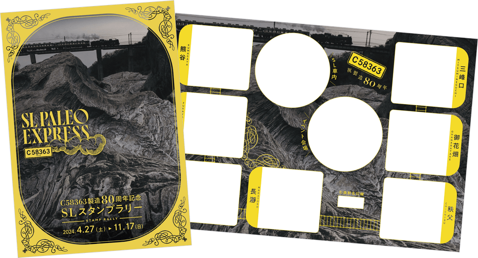 傘寿を象徴する「濃黄色」を使用し、C58363の長い歴史を表現したスタンプ台紙に、SL停車駅やSL車内、指定イベント会場をめぐってスタンプを集めます。