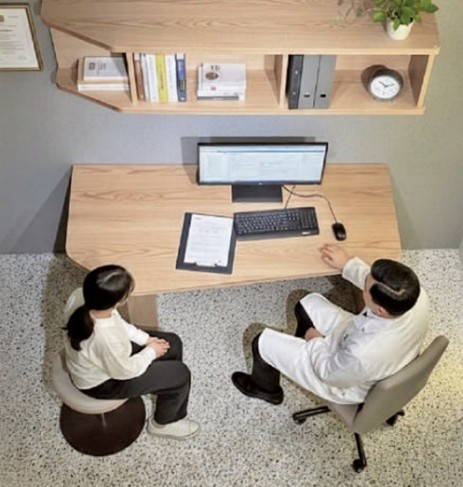 MEDITERIORのデスクは、体の向きを患者側へ少し開く角度に設計しました。PCの画面に向かっても、患者様と向き合っている印象を損なわず、安心感を与えます。正面でも横向きでもない絶妙な角度が、心地よい距離感となり、患者様に信頼感と安心感をもたらします。
