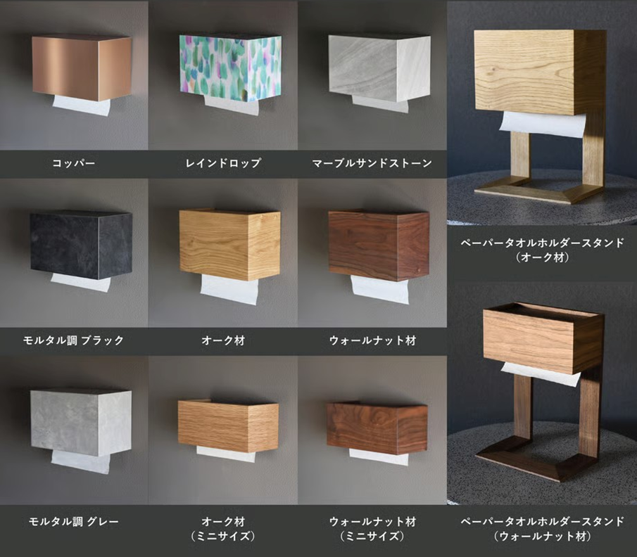 天然木や石調メラミン材などバリエーションが豊富で、様々な内装に合わせやすい種類を用意しています。壁掛け式で、ペーパータオルを下から取り出せるため衛生的です。小判~中判サイズのペーパータオルを入れてご使用頂けます。上部は小物などを置く飾り棚としても使えます。