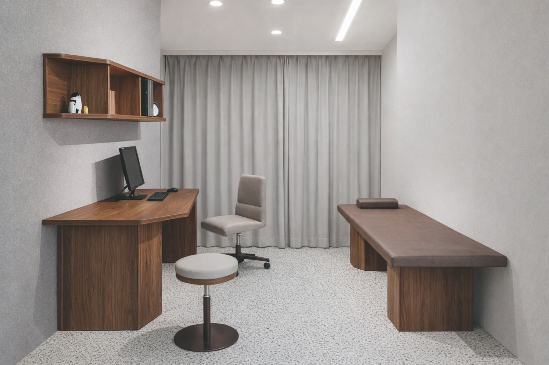MEDITERIORの家具は、患者様の緊張を和らげ、落ち着いて診察に向き合えるよう、温もりのある天然木を用いています。医療空間に馴染む洗練されたデザインで、医師・スタッフにとっても心地よい空間となります。