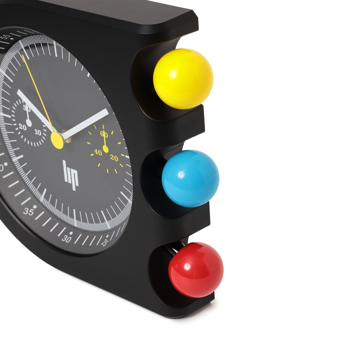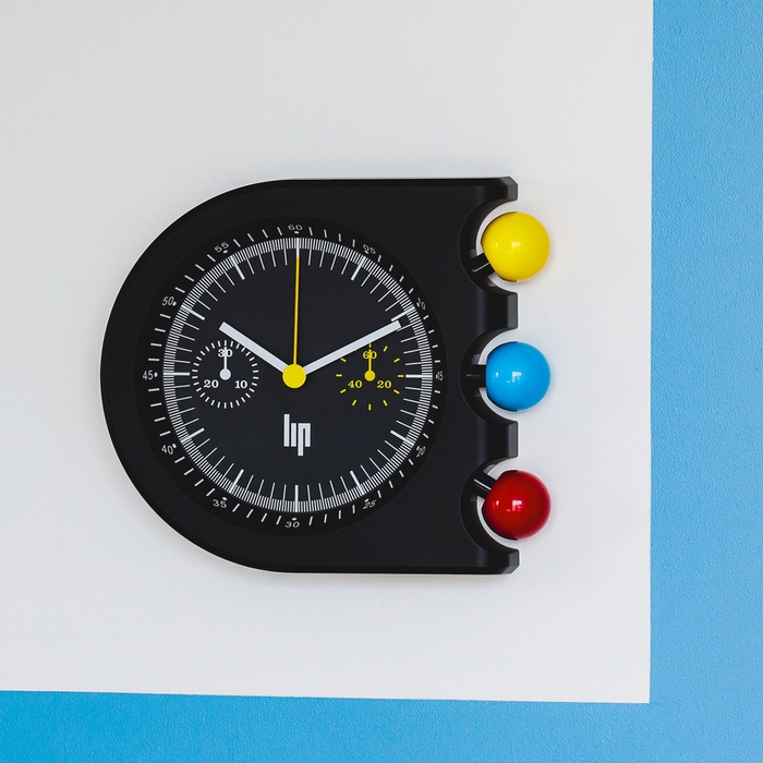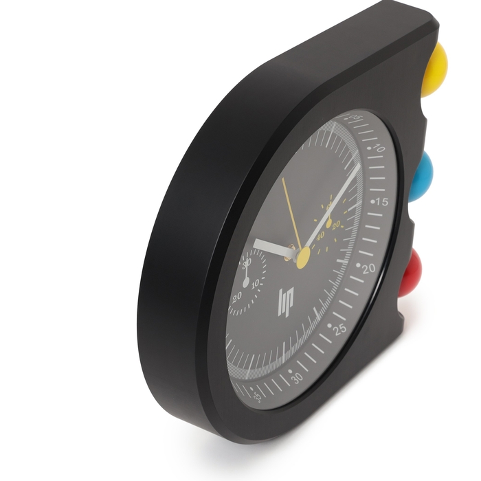象徴的な黄・青・赤の球体は、腕時計におけるクロノグラフボタンから“時を彩るリズムパーツ”へと進化し、壁面に鮮やかなアクセントを添えます。