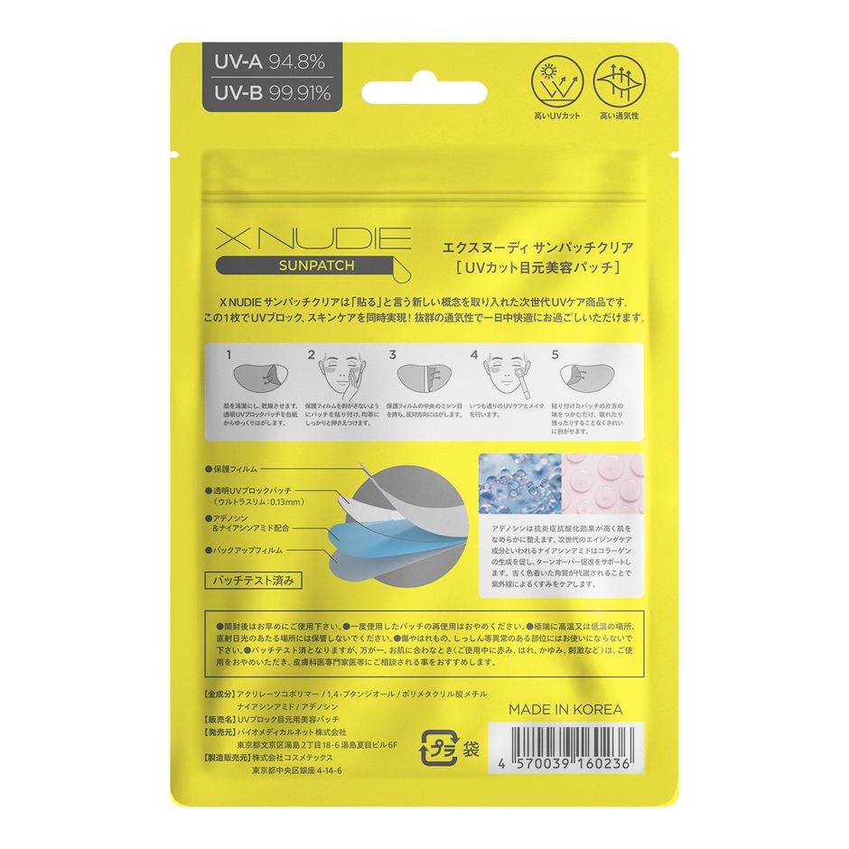「XNUDIE サンパッチクリア」は、「貼る」と言う新しい概念を取り入れた次世代UVケア商品であり、この1枚でUVカット、スキンケア、シミカバーの1枚3役を可能とします。美容成分を配合した物理的なバリアで紫外線を33.3%カット(UPF50+ ※UV-Bを99.9%、UV-Aを94.8%ブロック)します。装着部位の保湿、ケアを同時に対応することで、UVカットとスキンケアを同時に実現し一日中お肌を快適な環境で守ります。また装着後、通常通りのメイクが可能な為、普段と変わらない見た目もキープすることが可能です。