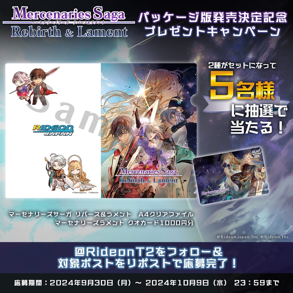 株式会社ライドオンジャパン(埼玉県川口市、代表取締役:其田 賢一)は、公式X(旧Twitter)にて、タクティカルSRPG「マーセナリーズサーガ リバース&ラメント」のオリジナルクリアファイルとQUOカードが当たるプレゼントキャンペーンを2024年9月30日(月)に開始いたしました。