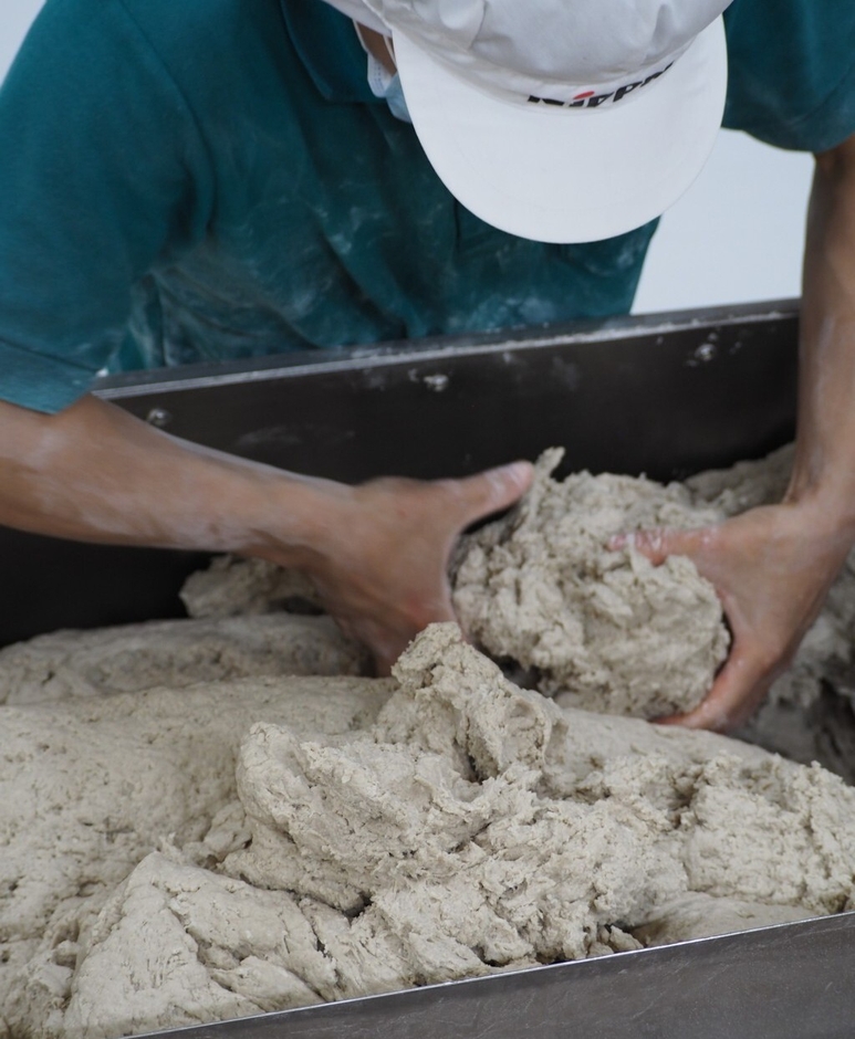 一般的な「手打ち」そばは小麦粉2割・そば粉8割でそば粉の含有量が多いのですが、オカベのナナサン年越しそばは小麦粉7割・そば粉3割の配合。何十種類もの小麦粉を使用し試作を重ね、手延べに適していて、かつそばの風味・食感を活かせる小麦粉を厳選しました。
