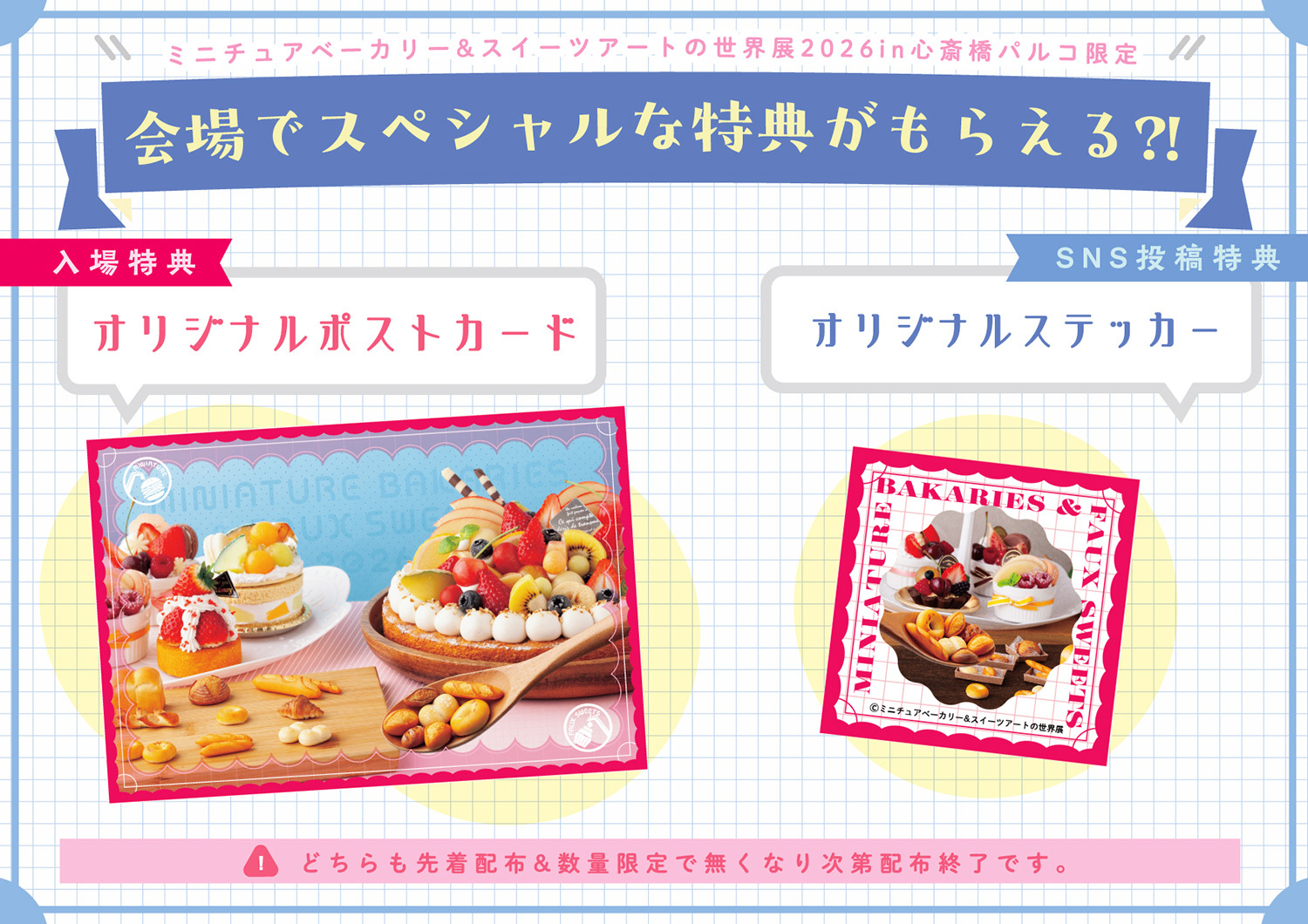 ミニチュアベーカリーとスイーツをモチーフにした本展限定オリジナルデザインのポストカードを、先着・数量限定でプレゼント。キービジュアルの世界観をそのまま落とし込んだ、甘く可愛い特別な一枚です。
