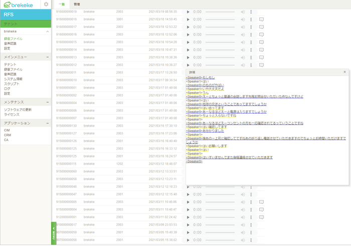 株式会社日本ブレケケ(本社:東京都豊島区、代表取締役:山出 晋)は、Brekeke PBX(Ver 3.10.2.8以降)で録音されたステレオ音声のテキスト化に対応したパッケージソフトウェア『Brekeke Recording File Server』(以下、Brekeke RFS)の新バージョンを2021年6月1日より提供開始します。従来のBrekeke RFSではモノラル音声のテキスト化のみ可能でしたが、新バージョンではステレオ音声にも対応し、認識結果を話者分離して表示できるようになりました。