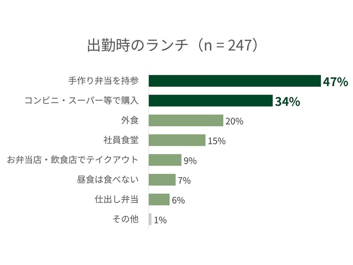 オフィス出社時、手作り弁当を持参する人が多く(34%)、次いでコンビニ・スーパー等で購入する人が多い(24%)。