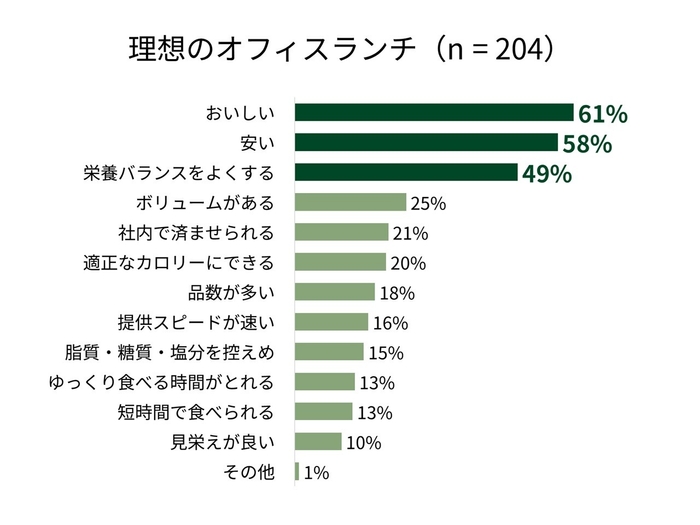 一方で、理想のオフィスランチとして多いのは、おいしい(61%)、安い(58%)、栄養バランスをよくする(49%)。