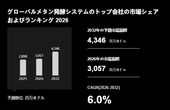 YHResearch調査チームの最新レポート「グローバルメタン発酵システムのトップ会社の市場シェアおよびランキング 2026」によると、世界のメタン発酵システム市場は2025年に2890百万米ドル規模に達すると予測され、2026年には3057百万米ドルに拡大する見込みです。2032年までに4346百万ドルに達すると予測されており、2026年から2032年までの期間における年平均成長率(CAGR)は6.0%と予想されています。