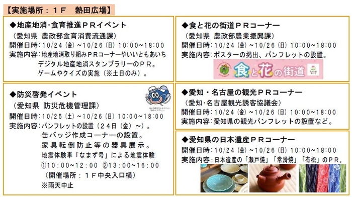 1階熱田広場では、包括協定に基づき発行された「あいち三英傑WAON」の寄付金贈呈式(本年9月16日実施)の様子や知事のコメントを紹介するVTRを放映します。また、愛知県が行う様々な取り組みや、県の観光などのPR、防災イベントを実施します。