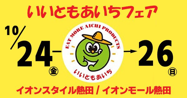 イオンリテール中部カンパニーは、10月24日(金)から26日(日)の3日間、イオンモール熱田およびイオンスタイル熱田にて、愛知県と協働し地産地消を推進する「いいともあいちフェア」(以下、当フェア)を開催します。