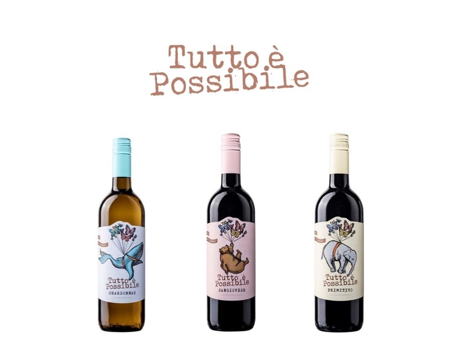 トゥット・エ・ポッシービレ(Tutto e' possibile)は「なんでもできる!」という意味。個性豊かな蝶が集まり、鯨や熊、象などの大きな動物を持ちあげているラベルデザインには、ひとりひとりの力は小さくても力を合わせれば不可能に思えることも叶う、というメッセージが込められています。