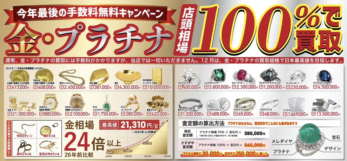 全国に展開する買取専門店さすがやでは、2025年12月1日から12月31日までの期間限定で、年末の特別企画「極限買取キャンペーン」を開催いたします。 今年一年のご愛顧に感謝を込めて、例年を上回る高額査定でお客様をお迎えします。