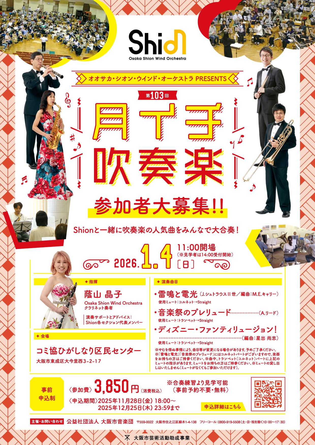 日本で最も長い歴史と伝統を誇る交響吹奏楽団のOsaka Shion Wind Orchestraを有する公益社団法人 大阪市音楽団(本社:大阪市住之江区/理事長:石井徹哉)は、月に一度、楽器を持っている方が集まって、Shionメンバーと一緒に吹奏楽曲を演奏できる人気イベント「月イチ吹奏楽」を2026年1月4日(日)に開催いたします。