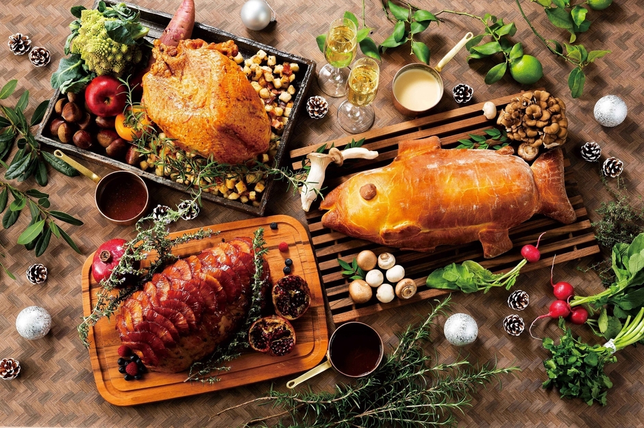 全長25メートルの「キッチンシアター」に並ぶ40種類以上のお料理をビュッフェスタイルでお楽しみいただけます。クリスマスの定番「ローストビーフ トリュフソース」は、低温真空調理でゆっくり4時間火入れした後、ガーリックとローズマリーをミックスしたバターでローストしています。ジューシーなお肉の旨味をぎゅっと閉じ込めた柔らかいビーフを、香り豊かなトリュフソースとともにご堪能ください。昨年大好評をいただいた「サーモンのパイ包み」や「七面鳥のロースト」などの特別メニューや、期間限定デザートがビュッフェテーブルを彩り、クリスマス気分を盛り上げます。