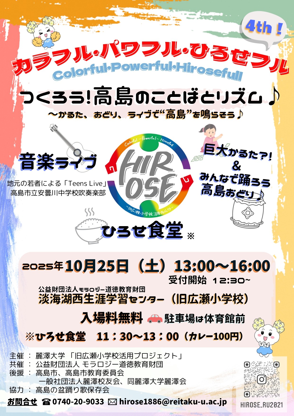麗澤大学(千葉県柏市/学長:徳永澄憲)の有志学生が、2025 年 10 月 25 日(土)に滋賀県高島市の旧広瀬小学校にて、廃校再生イベント「カラフル・パワフル・ひろせフル 4th つくろう!高島のことばとリズム♪~かるた、おどり、ライブで"高島"を鳴らそう♪」を開催します。