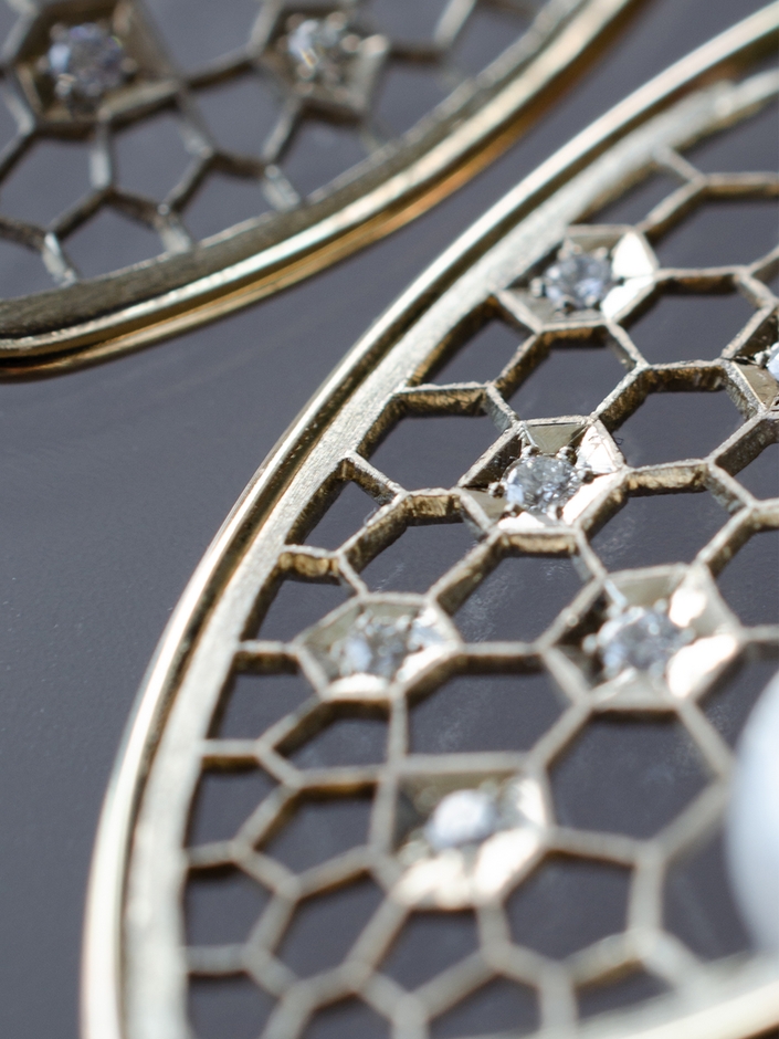 イタリアフィレンツェの伝統技法「nido d'ape」(ニードダアーペ)、蜂の巣状の透かし彫り。手間と時間を惜しまず、糸鋸で一つずつ丁寧に作られた透かし模様は現地で学んだ職人が製作。
