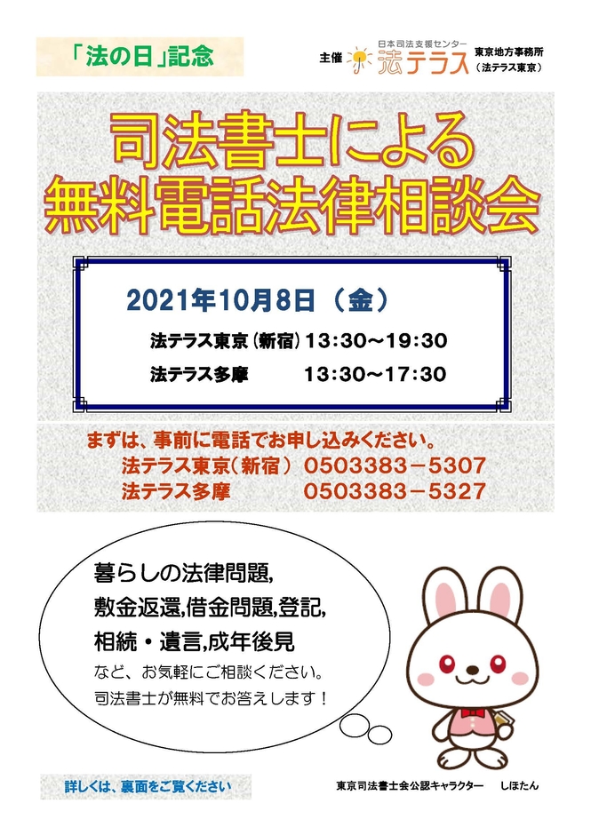 日本司法支援センター東京地方事務所は、「法の日記念 司法書士による無料電話法律相談会」を令和3年10月8日(金)に開催いたします。