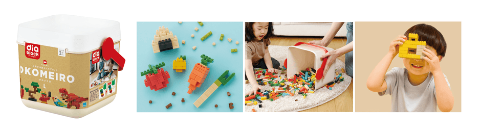 「サステナブルな素材・あそびやすいかたち・みんなうれしい容器」3つのテーマを元に新たに設計されたダイヤブロック。