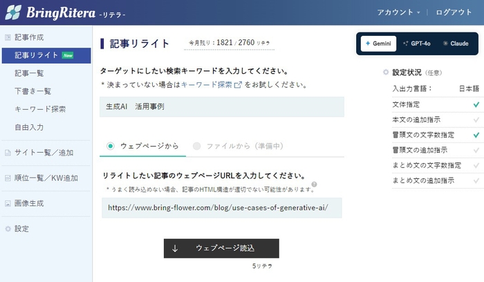 URLをもとに参考情報インプット、リライトまで可能なSEOに強いAIライティングツール「BringRitera(リテラ)」