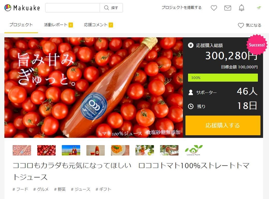 【Makuake目標達成!】開始後10日で30万円突破! 「ロココトマト100%ストレートジュース」で ココロもカラダも元気に!