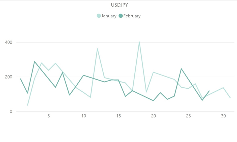 1月・2月のドル円の取引量とボラティリティ推移を示す上記グラフからは、2月に取引量が最大となったタイミングと、ボラティリティが最大となったタイミングが大きく異なっていることが確認できます。取引量が先行して最大値を記録し、後を追う形でボラティリティが最大値を記録するという、1月とは異なる展開を見せました。