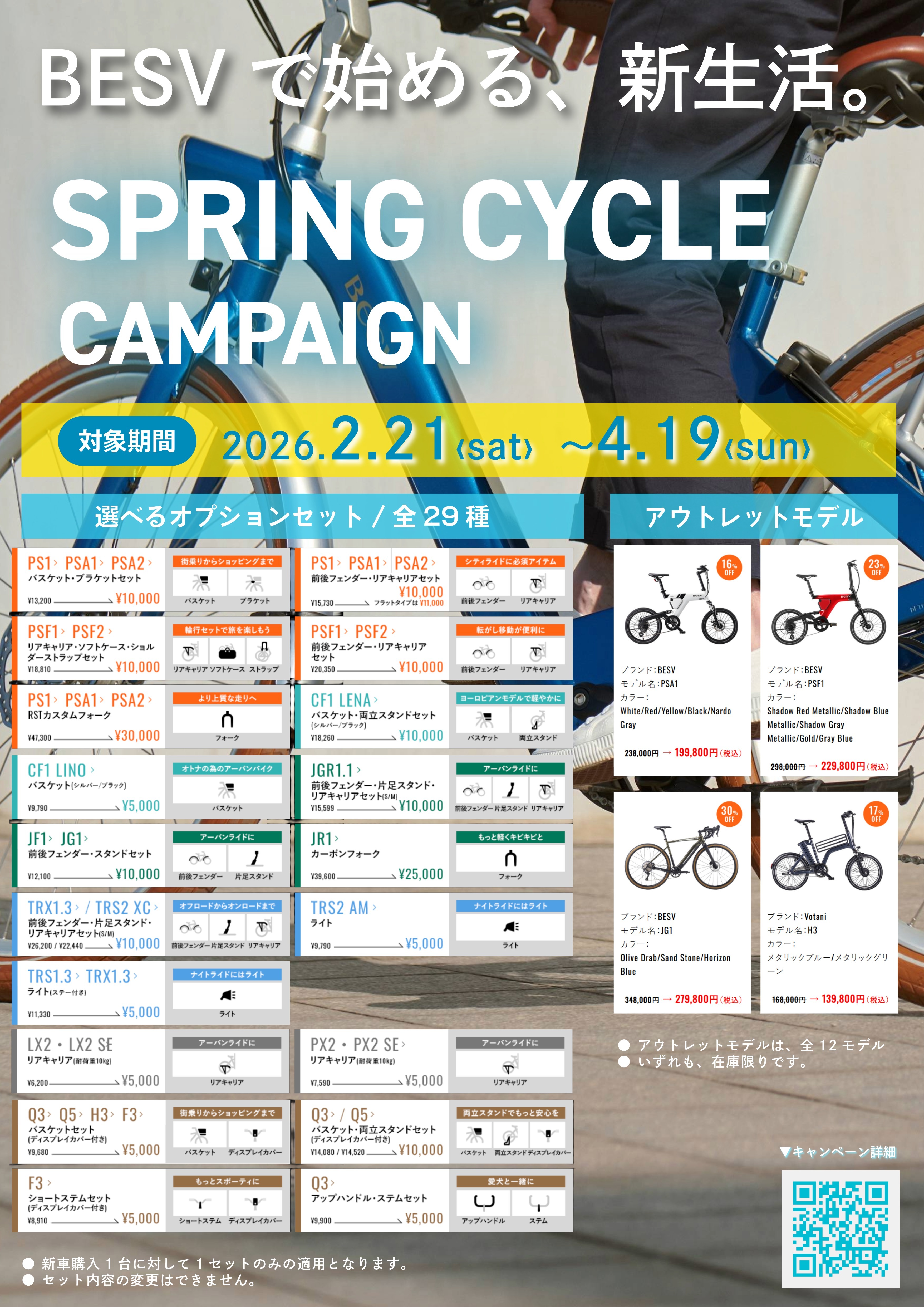 本キャンペーンは、BESV・SMALO・Votaniの3ブランド全23モデルを対象に、オプション特別施策と厳選アウトレットモデルを同時展開する春季限定プログラムです。拡大を続けるe-Bike市場を背景に、春の新生活需要に向けた大型施策として実施いたします。