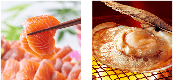 ◆ 北海道ならではのサーモンの他にも、生まぐろや平目のお造りは舟盛でご提供します。銘酒「一ノ蔵」と共にお楽しみください。