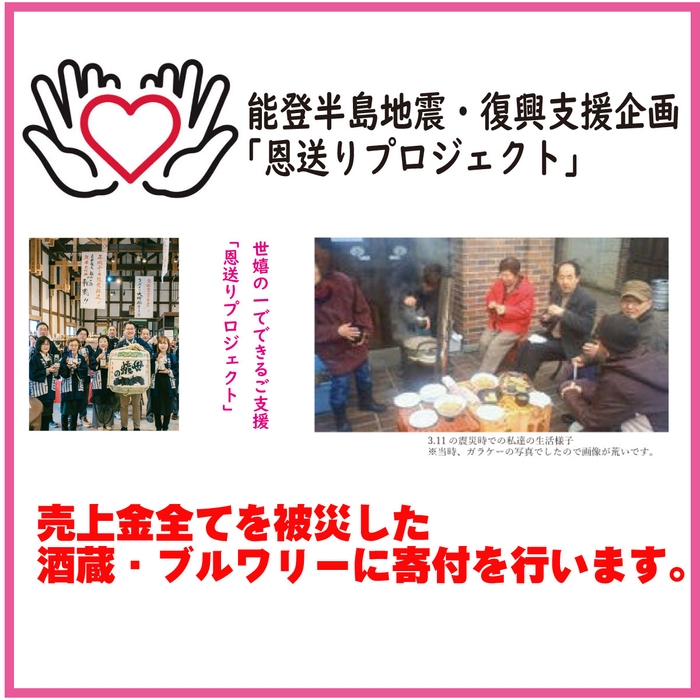 岩手県一関市にある老舗酒蔵 世嬉の一酒造株式会社(せきのいちしゅぞう、所在地:岩手県一関市、代表取締役社長:佐藤 航)は、令和6年能登半島地震の被災地支援として、「恩送りプロジェクト」をスタートし、該当商品の売上を全額寄付いたします。