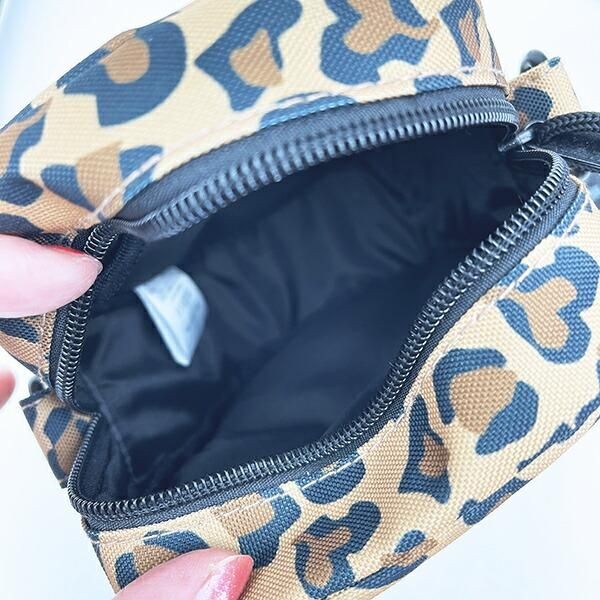ショルダーバック全体が存在感抜群のレオパード柄です。ちょっと癖の強さが出てしまうレオパード柄にキティの刺繍デザインによって柔らかさがでてバランスがとれたデザインです。ショルダーの紐はよく見てみると「HELLO KITTY」とデザインされこのロゴテープのようんな見た目がおしゃれです。