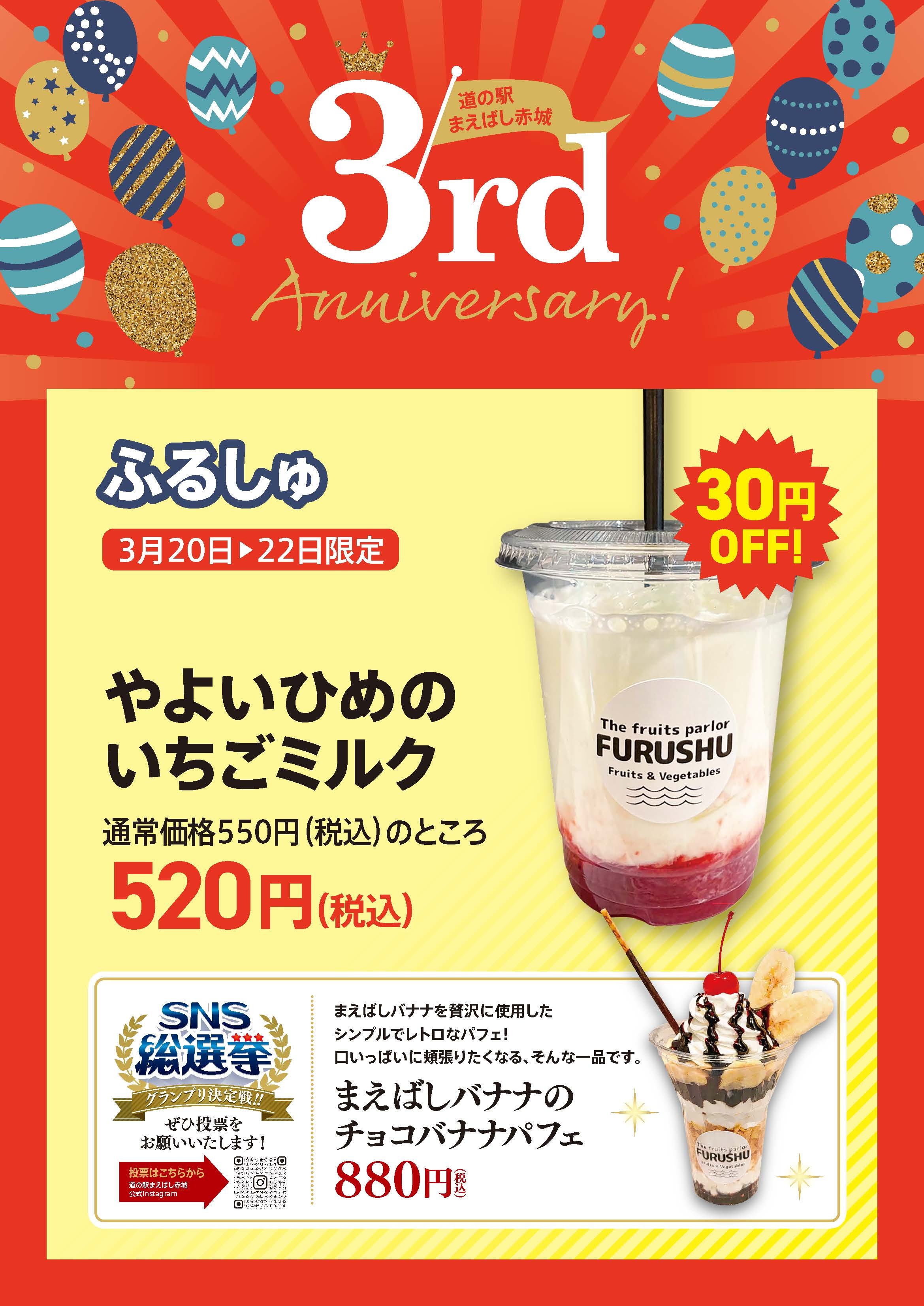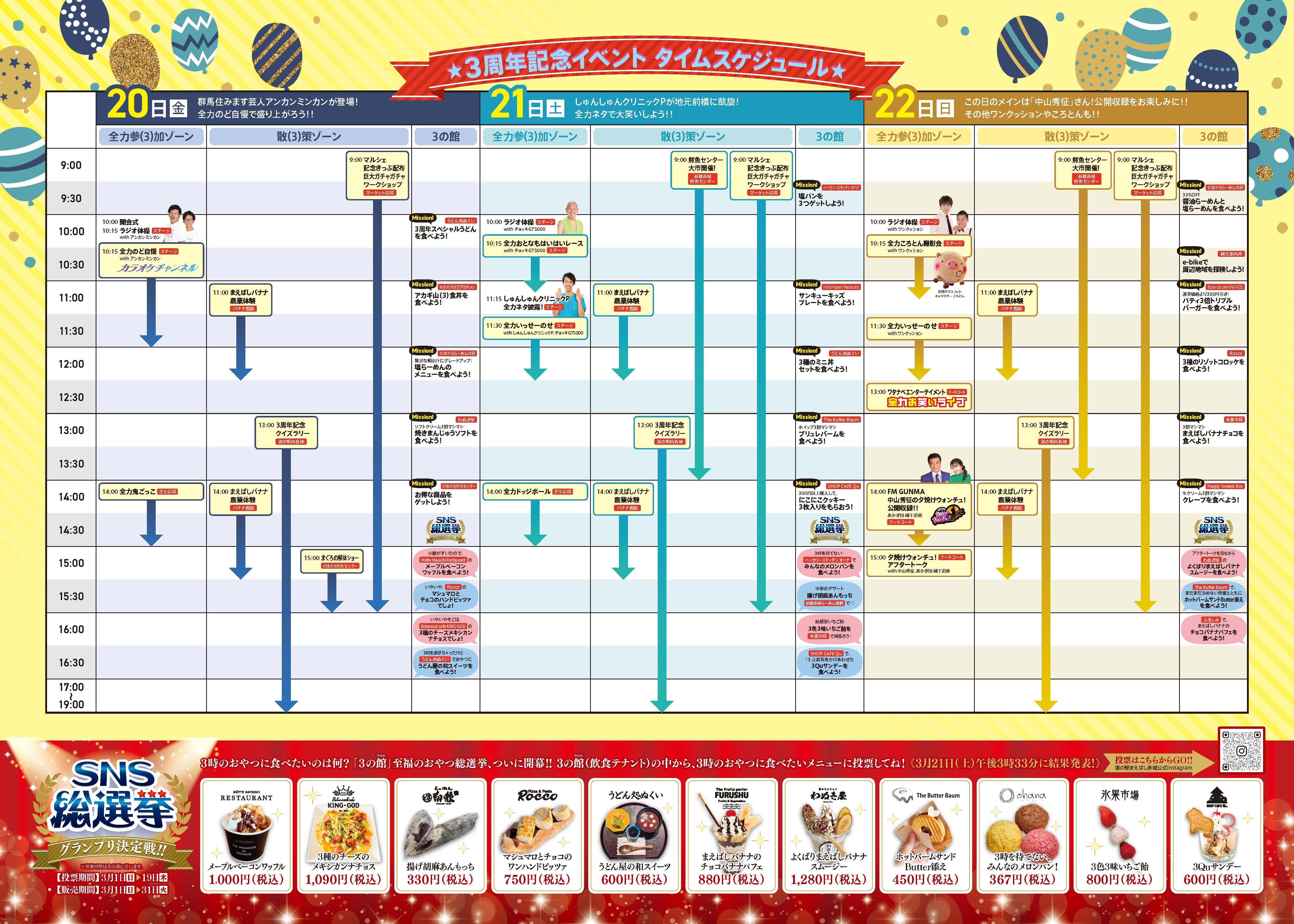 4年目も多くのお客様にご来場いただけるよう、さらに、県内に限らず、県外の方にも「道の駅まえばし赤城」の魅力をお届けできるように、3周年にかけあわせた「3」つのゾーン(全力参(3)加ゾーン、散(3)策ゾーン、3の館)をご用意し、道の駅各所で楽しめるコンテンツをご用意しました。大人気の道の駅イベント「全力シリーズ」をはじめ、群馬県出身の中山 秀征氏とあかぎ団 礒干氏が出演するFMGUNMA「中山秀征の夕焼けウォンチュ」初の公開収録などを実施いたします。また、各店舗では、日ごろの感謝を込め、「3」にちなんだサービスをご用意し、皆様を迎える準備をしております。さらに、今回初企画となるSNS総選挙も実施し、「3」にちなみ、「3時のおやつに食べたいのは何!?」と題し、お客様参加型の企画も計画しております。昨年も大好評だった『3周年記念マルシェ&ワークショップ』、『道の駅特別記念切符の配布』『巨大ガチャガチャ』など、盛りだくさんのコンテンツで皆さまをおもてなしいたします。