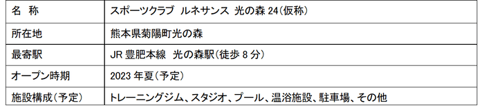 なお、当社は2019年度より、合志市においてフィットネス&コミュニティー「コレカラダ」の開業・運営支援を行っており、今後、「コレカラダ」及び「スポーツクラブ ルネサンス 光の森24(仮称)」を通じて、地域の皆様に「楽しい健康づくり」をご提案し、お客様お一人おひとりの「生きがい創り」に貢献してまいります。