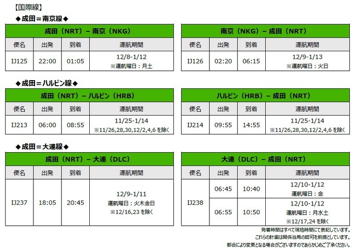 JALグループのLCCであるスプリング・ジャパン株式会社(以下:スプリング・ジャパン)は、2025年度冬ダイヤの成田=南京線、ハルビン線、大連線の運航を以下のとおり決定し、本日15時より販売を開始します。最新のダイヤにつきましては、スプリング・ジャパン公式サイトをご確認ください。