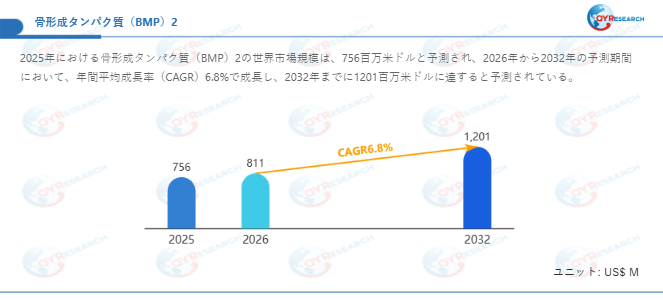 QYResearch調査チームの最新レポート「骨形成タンパク質(BMP)2―グローバル市場シェアとランキング、全体の売上と需要予測、2026~2032」によると、骨形成タンパク質(BMP)2の世界市場は、2025年に756百万米ドルと推定され、2026年には811百万米ドルに達すると予測されています。その後、2026年から2032年にかけて年平均成長率(CAGR)6.8%で推移し、2032年には1201百万米ドルに拡大すると見込まれています。
