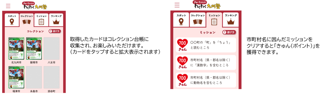 - 九州観光アプリ「きゅーちゃんのわくわく九州塾」は、2024年4月から当機構が公開したモバイルアプリで、九州の魅力を単なる情報発信だけでなく、楽しみながら発見することができます(2025年12月末日時点登録者約23,000人)。アプリ内で様々なミッションに参加して、「きゅん」(ポイント)を獲得し、ステージアップを目指します。ステージに応じた抽選会に参加したり、「きゅん」を様々な特典と引き換えることもできます。※アプリの楽しみ方はコチラをご覧ください https://x.gd/IX27o