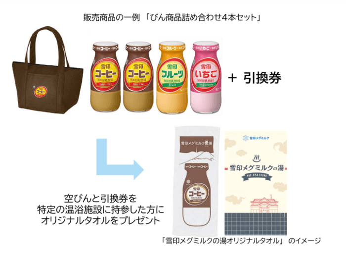 「びん商品詰め合わせ4本セット」をご購入いただいたお客様に、大阪府内の特定の温浴施設で「雪印メグミルクの湯オリジナルタオル」と交換できる引換券を、1点につき1枚プレゼントします。