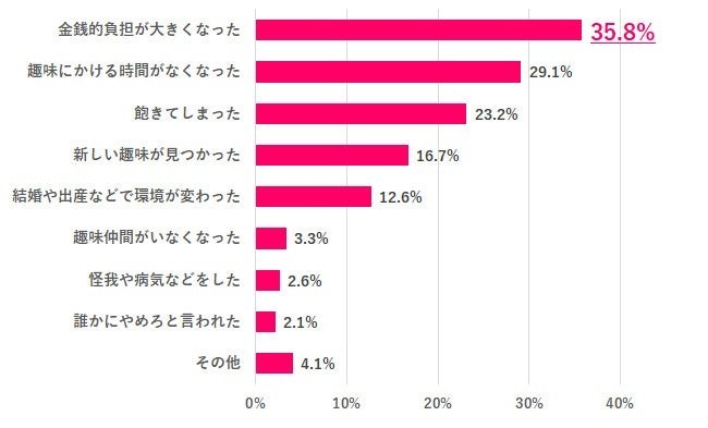 これまでに趣味を辞めようとしたもしくは辞めた理由を聞いたところ、1位「金銭的負担が大きくなった」35.8%、2位「趣味にかける時間がなくなった」29.1%、3位「飽きてしまった」23.2%でした。その他のコメントでは、「老後のことを考えて」や「引っ越しをしたから」などがありました。