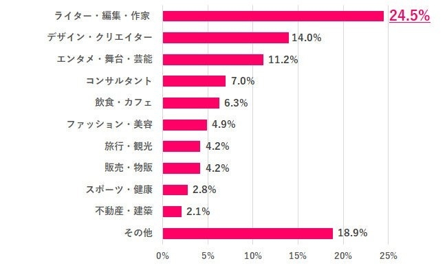 Q.6で趣味を仕事にしたいと「かなり思う」「やや思う」、「既に趣味を仕事にしている」と回答した人に、仕事にしたいもしくは仕事にしている趣味を聞いたところ、「ライター・編集・作家」24.5%が最も多い回答でした。
