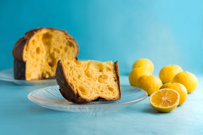 レモンのペーストとレモンピール、さらにリモンチェッロを使った、レモンをたっぷりと感じられる爽やかなパネットーネです。