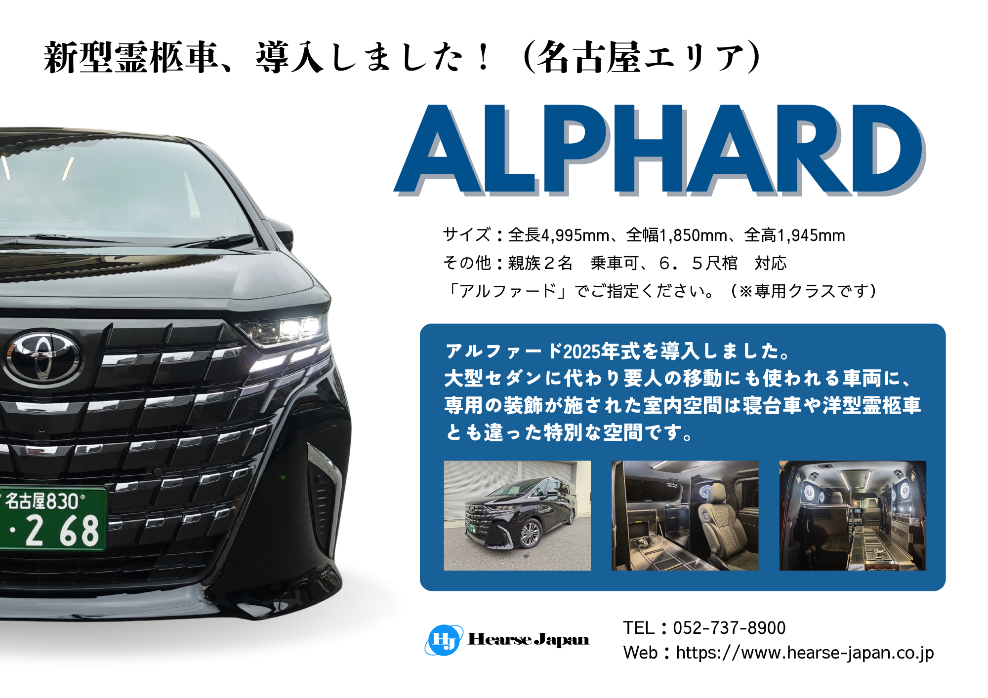 株式会社ハース・ジャパン(本社:愛知県)は、名古屋市および近郊での霊柩車配車サービスにおいて、新たに2車種(アルファード/メルセデス・ベンツ)の霊柩車を導入しました。